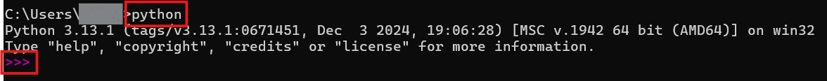 정상적으로 실행되면 Python 인터프리터가 실행되며, >>> 프롬프트가 나타납니다.