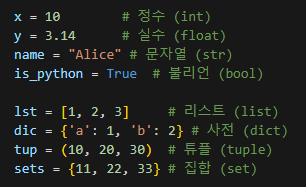 변수는 데이터를 저장하는 공간입니다. Python에서는 변수를 선언할 때 자료형을 명시할 필요 없이, 값을 할당하면 자동으로 타입이 지정됩니다.